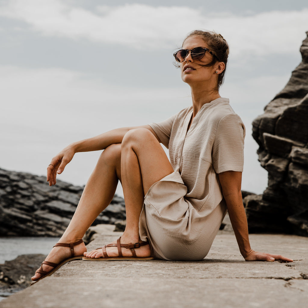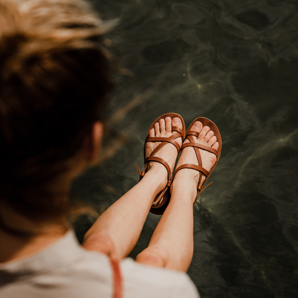 I love the look of the sandal and the fact that the sole has no heel. The only thing is that it's quite loose around my foot all though the length is perfect. I wear a size 8 and followed the advice on the site and bought a size 9 as recommended, but the straps that go over my foot don't fit as snug as I was hoping for. I have pierced more holes to tighten it a bit more, but it's still loose unfortunately.
